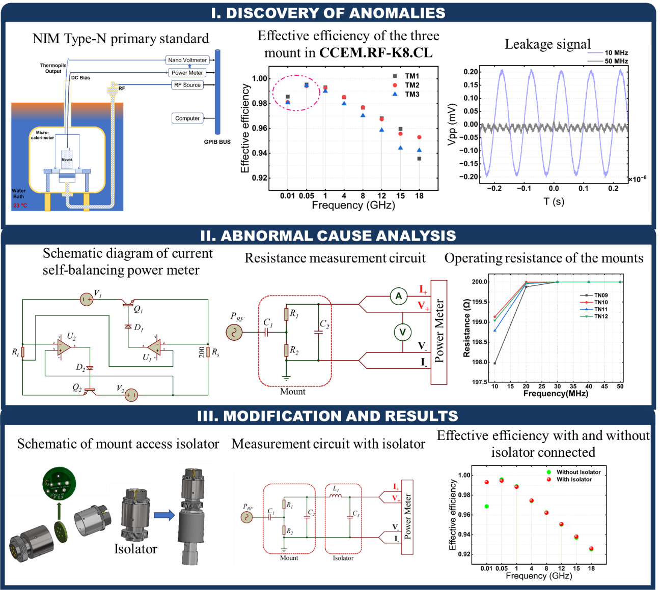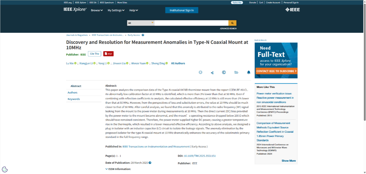 近日,我校信息工程学院联合中国计量科学院研究院在计量测试领域国际顶级期刊《IEEE Transactions on Instrumentation and Measurement》(中科院二区TOP期刊,IF=5.6)上发表关于射频功率计量的研究论文“Discovery and Resolution for Measurement Anomalies in Type-N Coaxial Mount at 10MHz”(2025, 3551151)。该论文以我校为第一单位,硕士研究生聂禄为第一作者,中国计量科学研究院的崔孝海研究员和我校李向军副教授为论文共同通讯作者。