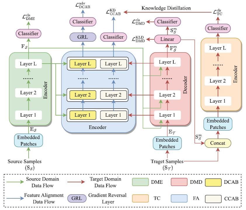 研究成果《Discriminative Vision Transformer for Heterogeneous Cross-Domain Hyperspectral Image Classification》提出基于视觉Transformer的CD-DViT方法。(1)域映射分支将源域样本经编码器-解码器映射至目标域以扩充训练样本,缓解小样本问题;(2)特征对齐分支构建域级和类级对齐模块,利用交叉注意力机制结合域判别器学习域不变特征,并通过类间注意力权重优化跨域一致性;(3)目标分类分支整合映射样本与目标样本训练分类器,同时通过知识蒸馏将分类器知识迁移至特征对齐过程,增强跨域判别性。三个分支通过域映射增强数据基础、特征对齐消除域差异、分类与蒸馏协同优化,形成端到端的异构跨域分类框架。