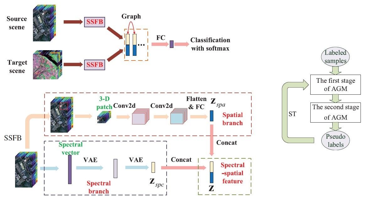 研究成果《Adaptive Graph Modeling With Self-Training for Heterogeneous Cross-Scene Hyperspectral Image Classification》针对异构跨场景高光谱图像分类中的小样本问题,提出了一种结合自适应图建模(AGM)与自训练(ST)的方法AGM-ST。通过可学习网络生成基于光谱-空间相似性的图权重,并引入自适应阈值剔除弱关联,构建鲁棒的跨场景图结构。同时,利用自训练技术迭代生成伪标签,增强目标场景的语义信息,从而优化图模型。该研究解决了传统图模型稀疏性和伪标签噪声问题,为异构迁移学习提供了有效解决方案。