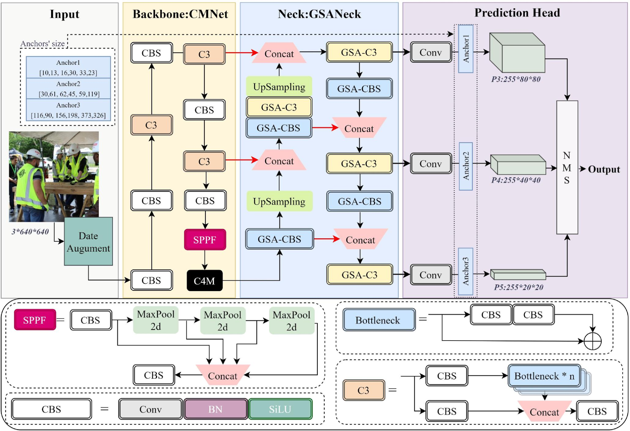 研究成果《Construction personnel dress code detection based on YOLO framework》提出一种基于YOLO网络的施工人员着装规范检测算法,在主干网络中引入多头自注意力机制,构建了卷积与注意力混合的CMNet主干网络,使模型具备全局视野并提升对遮挡、小目标物体的检测能力;在颈部网络设计了轻量化的Ghost Shuffle Attention-Conv-BN-SiLU(GSA-CBS)模块,在保证性能前提下压缩了模型参数量;采用SIoU损失函数与Soft NMS后处理模块优化检测精度。该算法较基准模型参数量显著减少,检测精度明显提升。