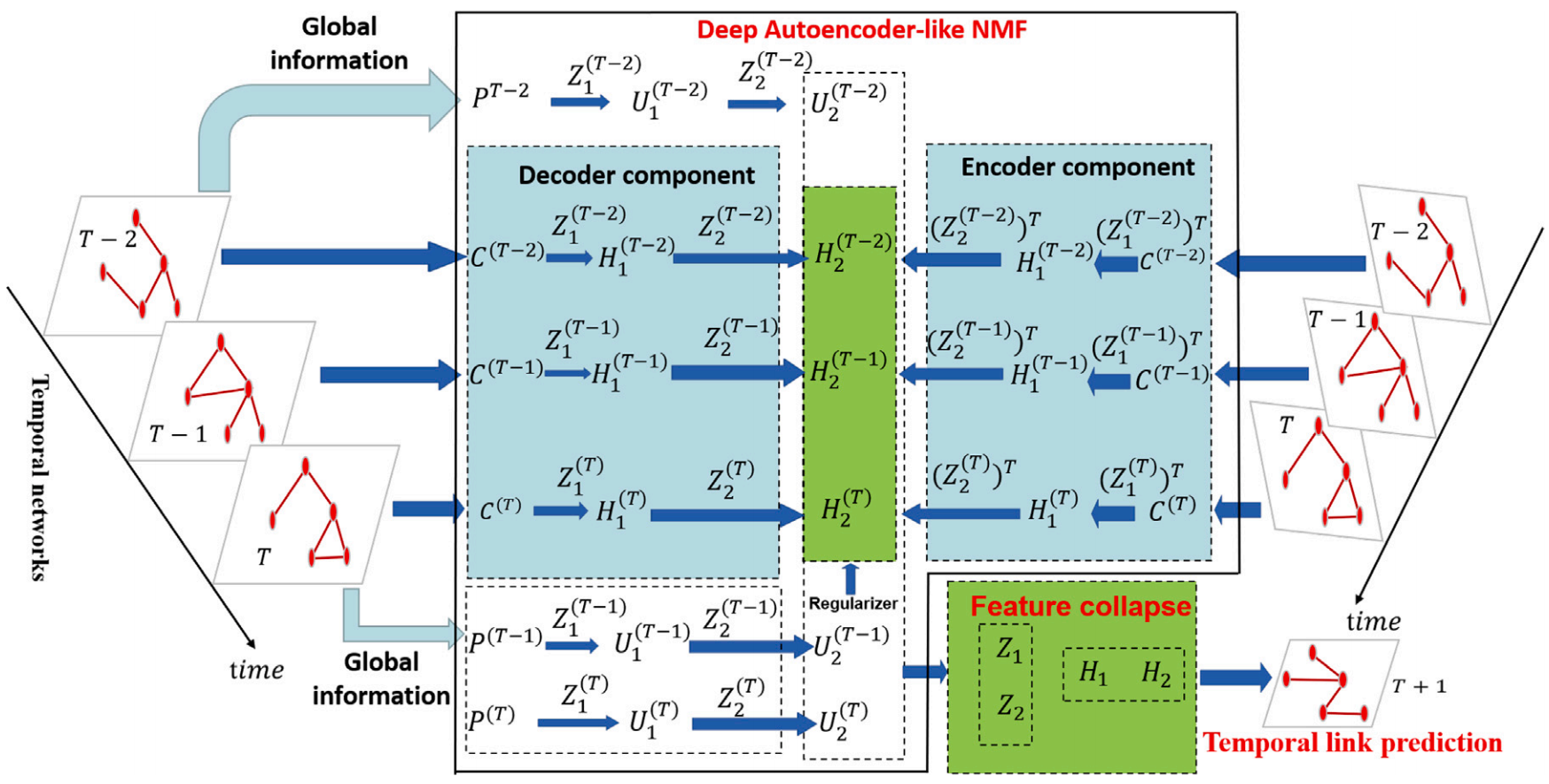 研究成果《Deep Autoencoder-like non-negative matrix factorization with graph regularized for link prediction in dynamic networks》针对时效网络链路预测问题,提出了两种图正则化深度自编码器NMF算法。通过将编码器融合到深度NMF模型,所提算法能充分挖掘出网络中的复杂层次信息。进一步,通过利用图正则化和PageRank分别挖掘时效网络的局部和全局拓扑信息。