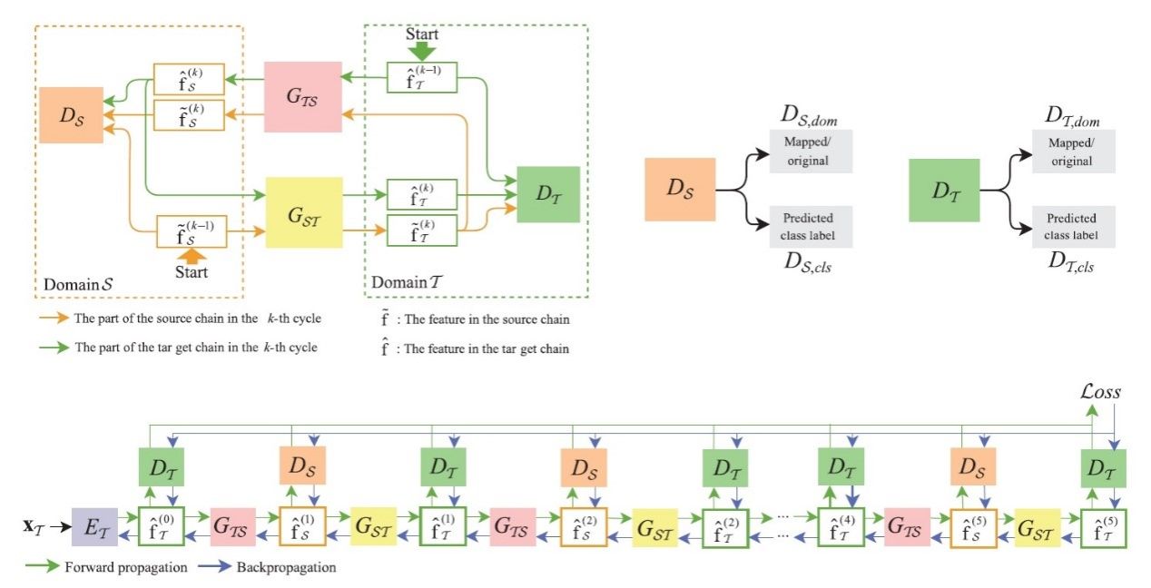 研究成果《Building Cross-Domain Mapping Chains From Multi-CycleGAN for Hyperspectral Image Classification》针对异构高光谱图像分类中的域差异与小样本问题,提出跨域映射链模型(CDMC)。通过扩展CycleGAN的双向映射机制,构建多循环生成对抗网络,将单次映射拓展为多级链式映射,并结合辅助分类器约束类别分布一致性。该方法利用循环间误差累积与反向传播优化生成器的跨域映射能力,解决传统单循环模型映射误差大、忽略类别特征对齐的缺陷,实现源域与目标域的高精度双向特征转换。通过多级映射链增强生成网络的鲁棒性,同时兼顾域适应与类别判别性,提升异源数据间的知识迁移效果。