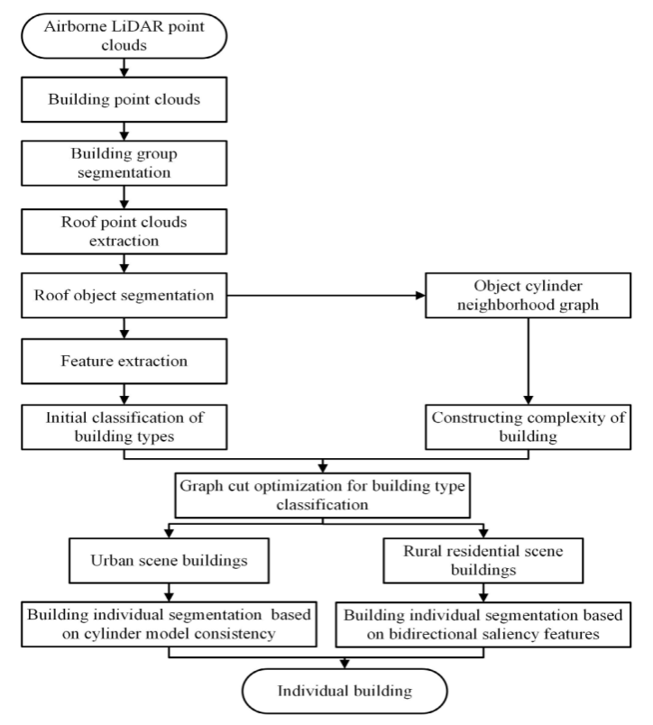 研究成果《Scene Adaptive Building Individual Segmentation Based on Large-Scale Airborne LiDAR Point Clouds》针对建筑物单体分割问题,提出了一种基于大规模机载激光雷达点云的场景自适应建筑物单体分割(SABIS)方法。该算法在国内外三个大场景数据集中获得了良好的性能,并与四种基准方法进行了定量和定性评估,各种精度均明显优于当前最先进的算法。