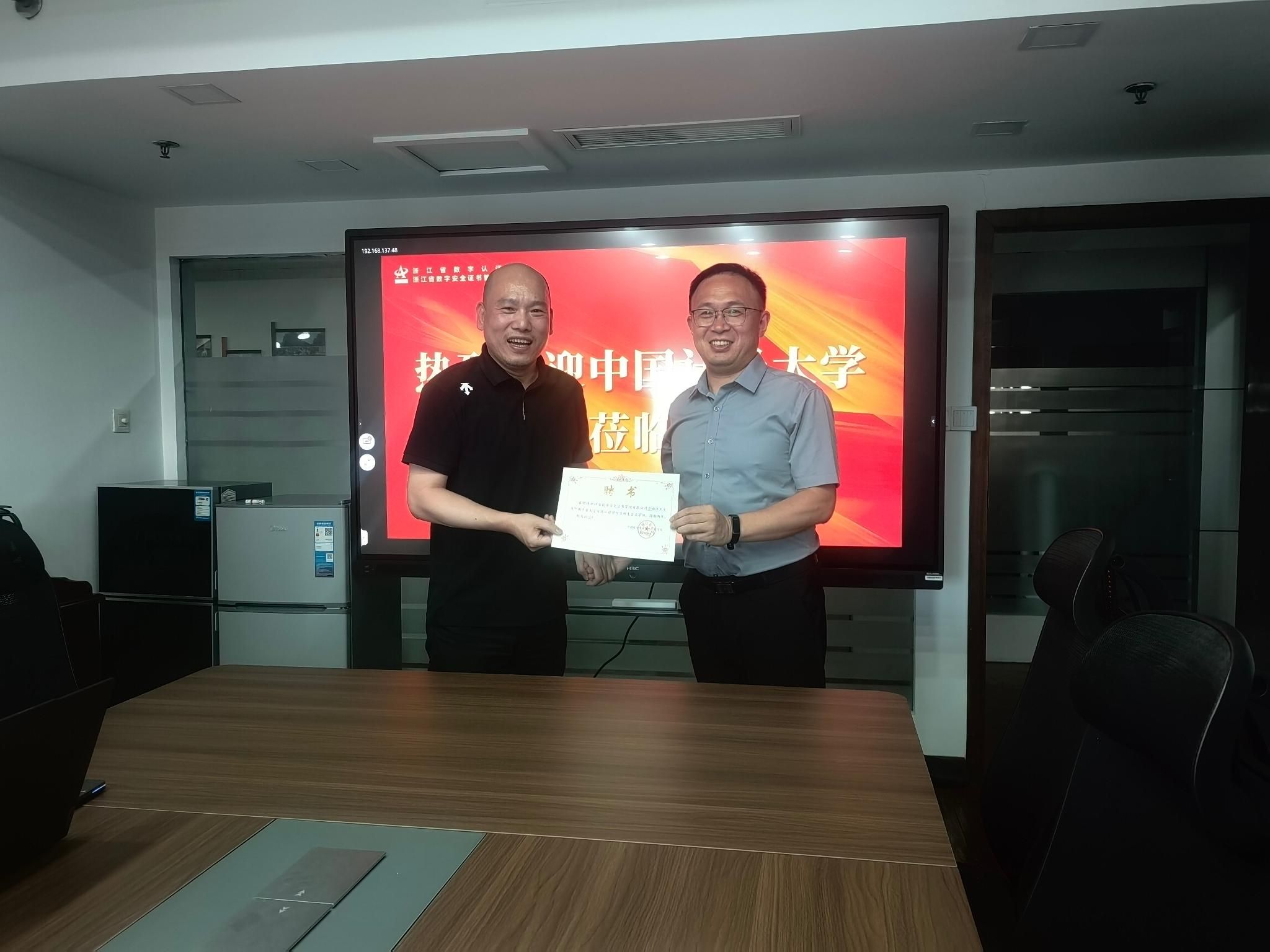 7月7日,学院党委副书记杨广军、辅导员常腾飞前往浙江省数字安全证书管理有限公司进行走访交流。在参观公司中心机房和听取公司情况介绍后,双方围绕电子认证行业人才培养、企业用人需求以及后续实习基地建设方面开展了进一步的交流与探讨,达成了相关共识与合作意向。