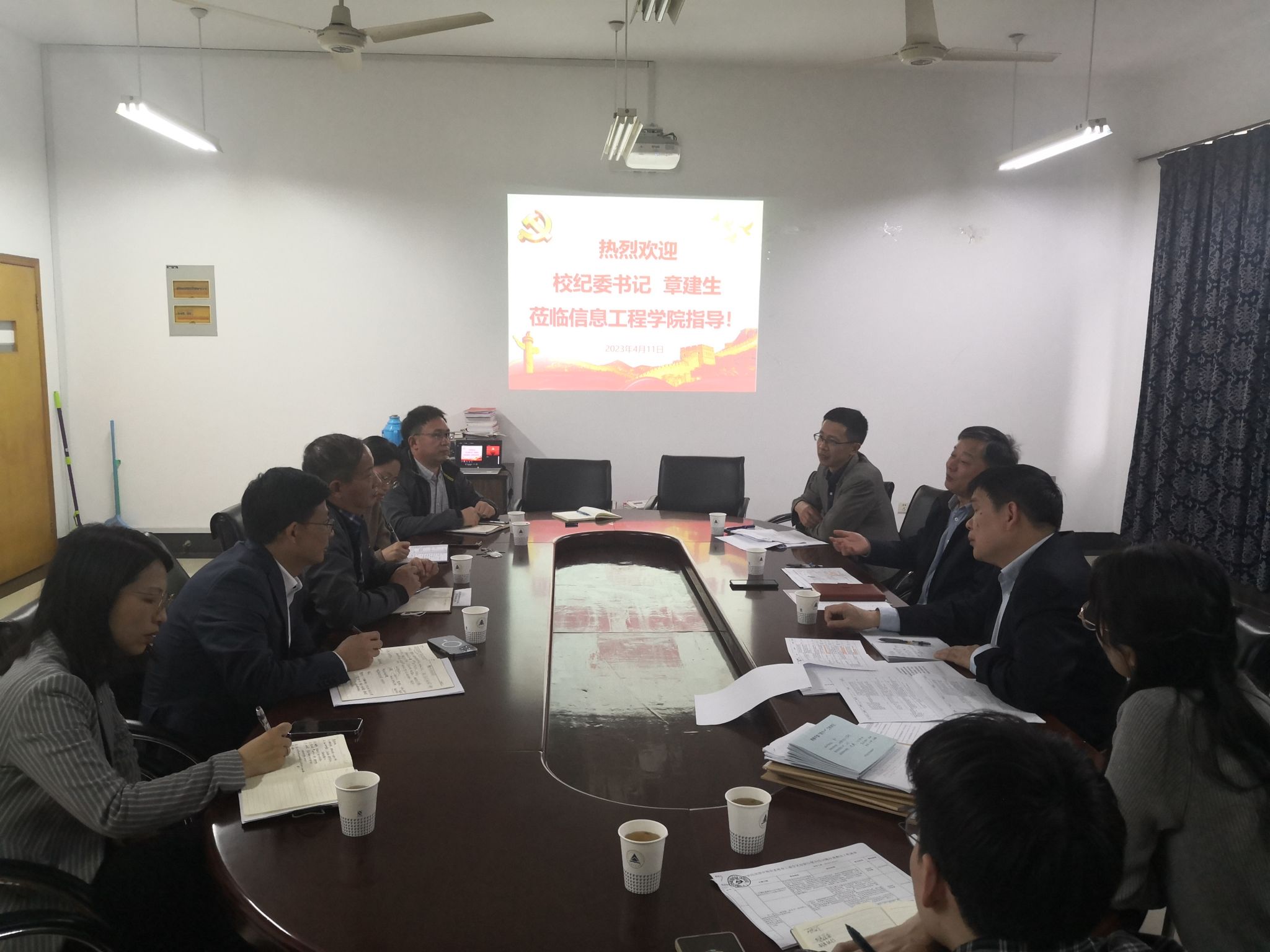 4月11日下午,校纪委书记章建生到信息工程学院指导落实省委教育工委交叉巡察反馈共性问题整改工作,校纪检监察室主任冯爱明、发展规划处副处长黄乐富参与指导。学院全体党政领导班子成员参加会议。