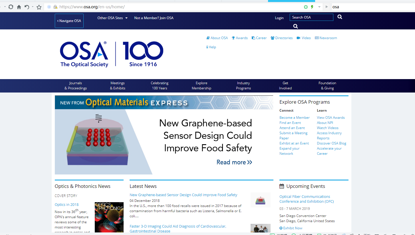 近日,在肖丙刚教授的悉心指导下,我校信息工程学院研究生宫绍康以第一作者身份在国际知名期刊《Optical Materials Express》(2017-2018最新影响因子2.566,工程技术 2区)上发表题为"Hybridization-induced dual-band tunable graphene metamaterials for sensing"的学术论文(肖丙刚教授为通信作者),并被美国光学学会(OSA,世界上最大的光学和光子学信息同行评审集合)出版社在首页以“New Graphene-based Sensor Design Could Improve Food Safety”为题进行了报道(详见https://www.osa.org/en-us/home/)。