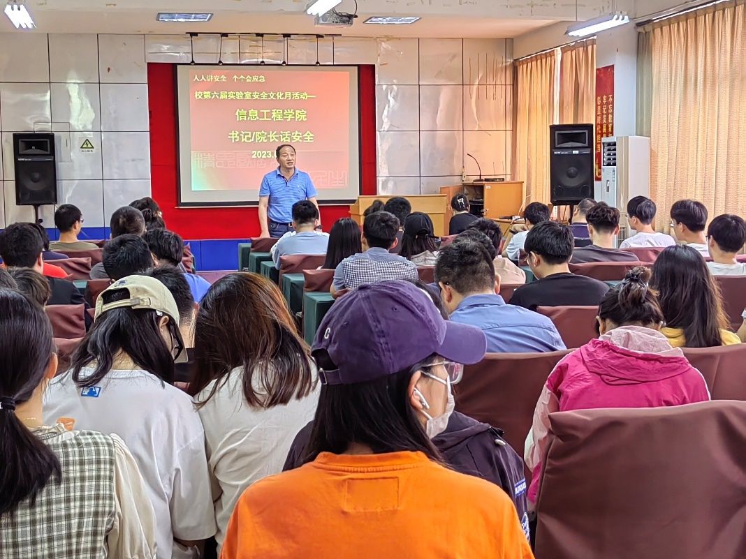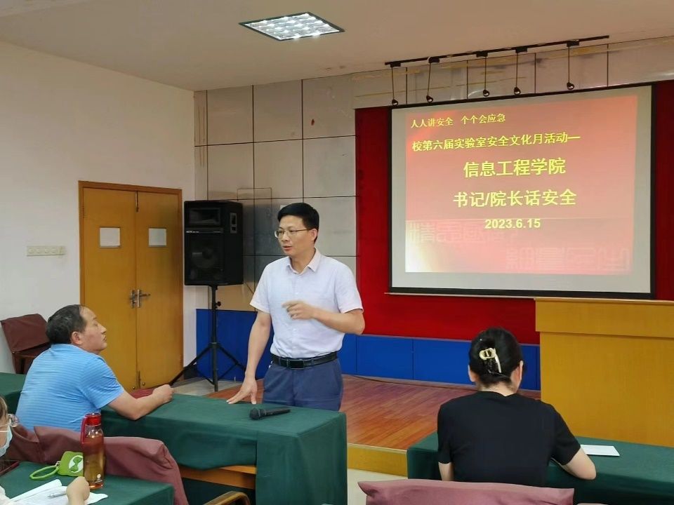 为深入宣传贯彻党的二十大精神和习近平总书记关于安全生产重要论述,全面弘扬实验室安全文化,响应学校开展的“人人讲安全 个个会应急”为主题的实验室安全文化月活动,发动信息学院师生共同参与安全文化建设,提升师生应对实验室突发事故的处置能力和自我保护能力,筑牢学院实验室安全的“铜墙铁壁”,信息工程学院在6月15日下午举行实验室安全文化月活动。活动内容包括院长/书记话安全、实验室主任解读实验室安全要求、消防安全演习。信息工程学院党委书记郑成林、院长周浩淼、副院长赵建伟、实验中心主任宋爱军、实验中心全体教师、近两年新进教职工、22级研究生参加了此次活动,会议由副院长赵建伟主持。