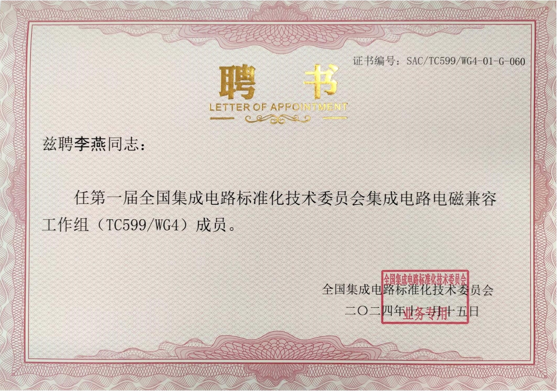 李燕博士此次受聘为工作组成员,不仅是对其在集成电路电磁兼容领域研究成果与工程实践能力的充分肯定,也彰显了信息工程学院在集成电路与微电子工程相关领域的学术影响力。今后,李燕老师将积极参与国家标准的制定、研讨与推广工作,进一步推动学院科研成果服务国家战略,助力我国集成电路行业的高质量发展。