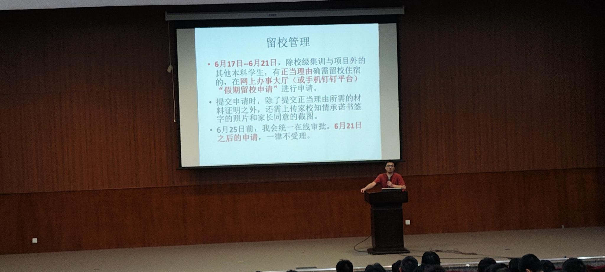 为切实加强2022级本科生教育管理工作,进一步提高学生诚信考试意识,强化学生职业规划意识,做好暑期留校学生安全教育工作。6月14日,信息工程学院于东校区KA105报告厅召开了2022级本科生年级大会。2022级本科生辅导员潘柏桦以及全体2022级本科生参加会议。